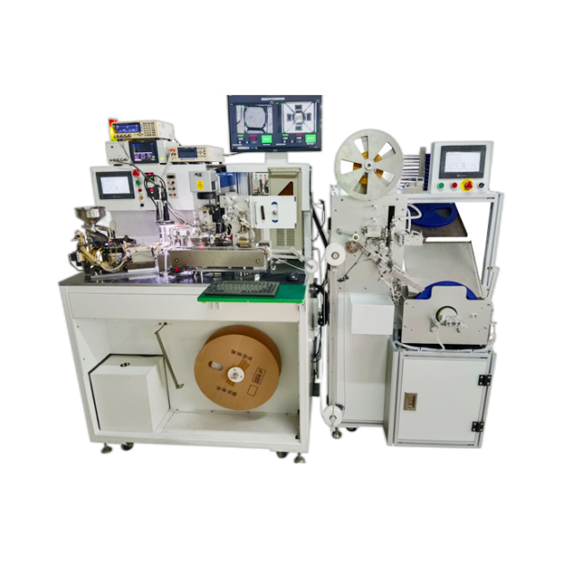 High efficiency, capacity 10K-13 KPCS/H; Perfect combination of test package and visual appearance, easy debugging and simple operation; The self-developed defect analysis algorithm is efficient, fast and accurate. Damage, hidden crack, dirt, glue overflow, copper leakage, poor lead, etc.; It can detect the phenomenon of mixed material, side material, reverse material and empty material, and ensure 100% consistency of loading direction; Automatic replacement of reel, cutting of braid, threading of braid, automatic sticking of tail glue and other functions;